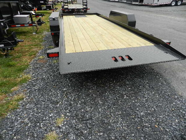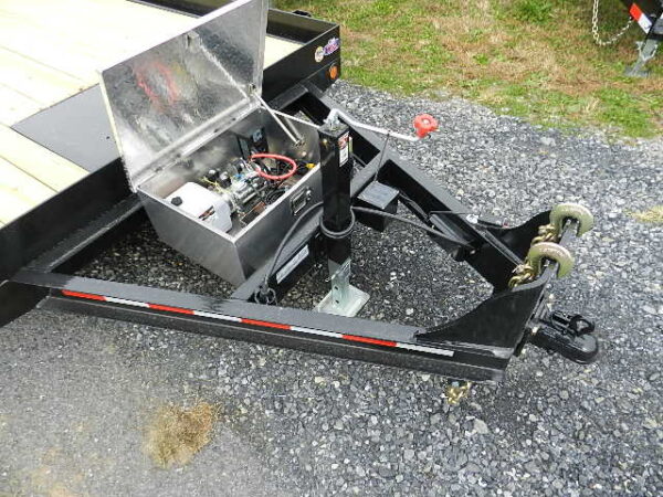 • Stationary “Load-First” Deck: The fixed 4-foot front section is perfect for securing high-value attachments or palletized materials that need to stay level while the rest of the deck tilts to receive your machine.